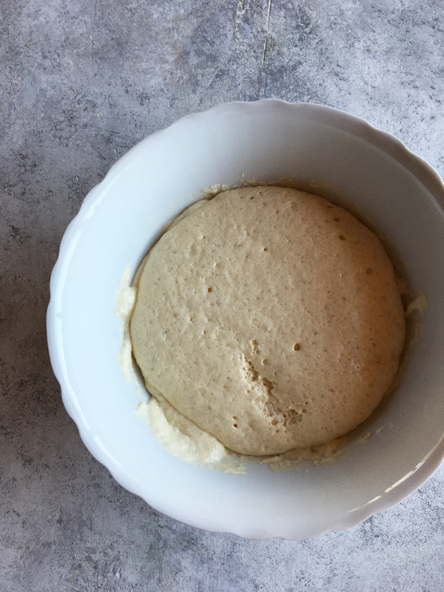 Mescolate con una spatola per amalgamare il composto, poi coprite la ciotola con della pellicola e ponete a lievitare per circa un’ora in forno tiepido. L’impasto alla fine della lievitazione, dovrà risultare pieno di bolle.