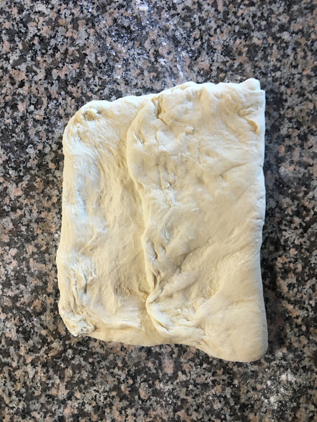 Trascorso tale tempo dovrete effettuare le pieghe di rinforzo, stendete l’impasto sul piano infarinato, esclusivamente con le mani, cercando di formare un rettangolo e ripiegate la parte sinistra verso il centro, e poi la destra sulla sinistra. Otterrete così un rettangolo più stretto che ripiegherete ancora allo stesso modo.