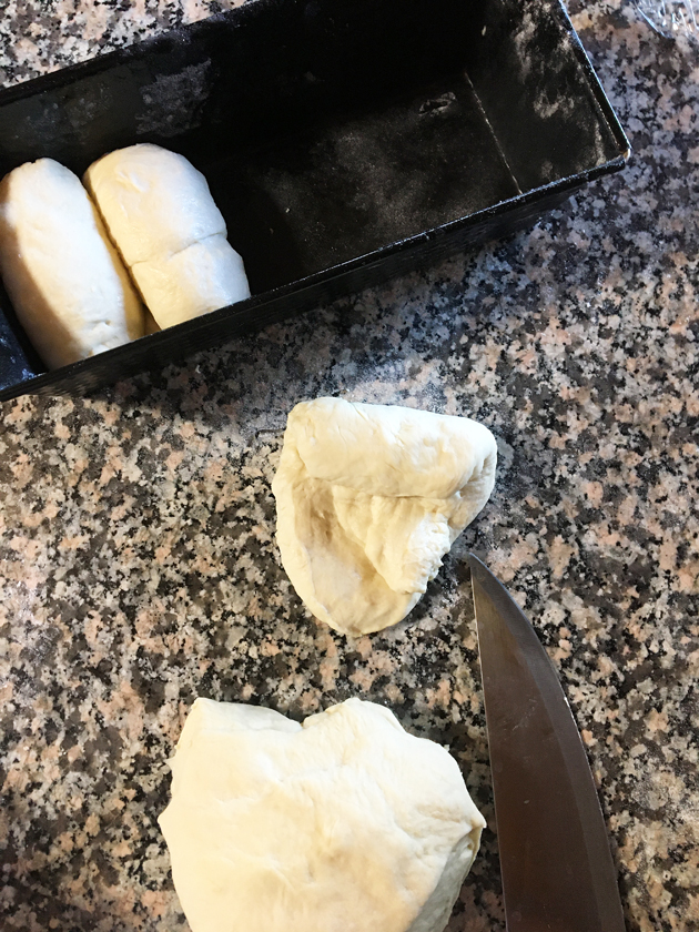 Dividete l’impasto in sei parti uguali, di circa 150g ciascuno, stendete leggermente con le mani ciascuna parte e arrotolatela, a formare un salsicciotto.