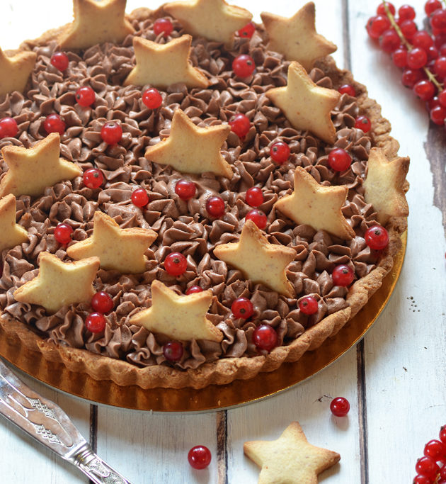 Questo dolce per me rappresenta il dessert delle grandi occasioni o delle feste natalizie. E’ speciale grazie alla frolla alle mandorle, estremamente goloso per l’accoppiata crema di latte e ganache, scenografico per la decorazione con biscottini a stella e ribes, che volendo potrete sostituire anche con i lamponi. Potrebbe sembrare complicato realizzarlo ma in realtà è semplice e alla portata di tutti.