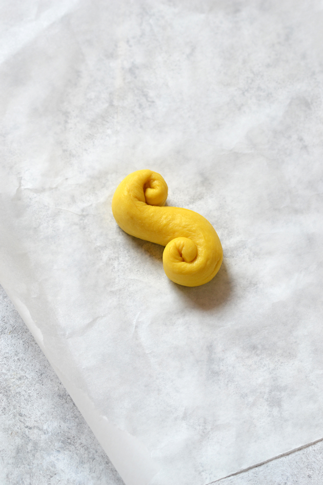 Da ogni pezzetto di impasto ricavatene un serpentello che andrete ad arrotolare alle estremità, formando una specie di esse.