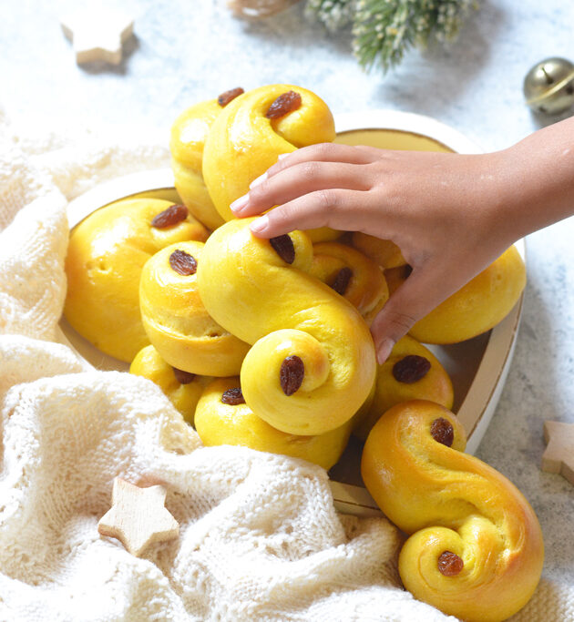 I Lussekatter o gatti di Santa Lucia, sono delle brioche la cui forma ricorda una s o appunto la coda di un gatto, tipiche della Svezia. Vengono realizzate per la festività di Santa Lucia, molto sentita in questo paese, dove le donne si vestono con una tunica bianca, legata in vita da un nastro rosso, e una corona di candele, a rischiarare la notte del !3 dicembre, che secondo la tradizione è la più buia dell’anno. Il colore di queste brioche, dato dallo zafferano, simboleggia proprio la luce e la loro vittoria sulle tenebre.