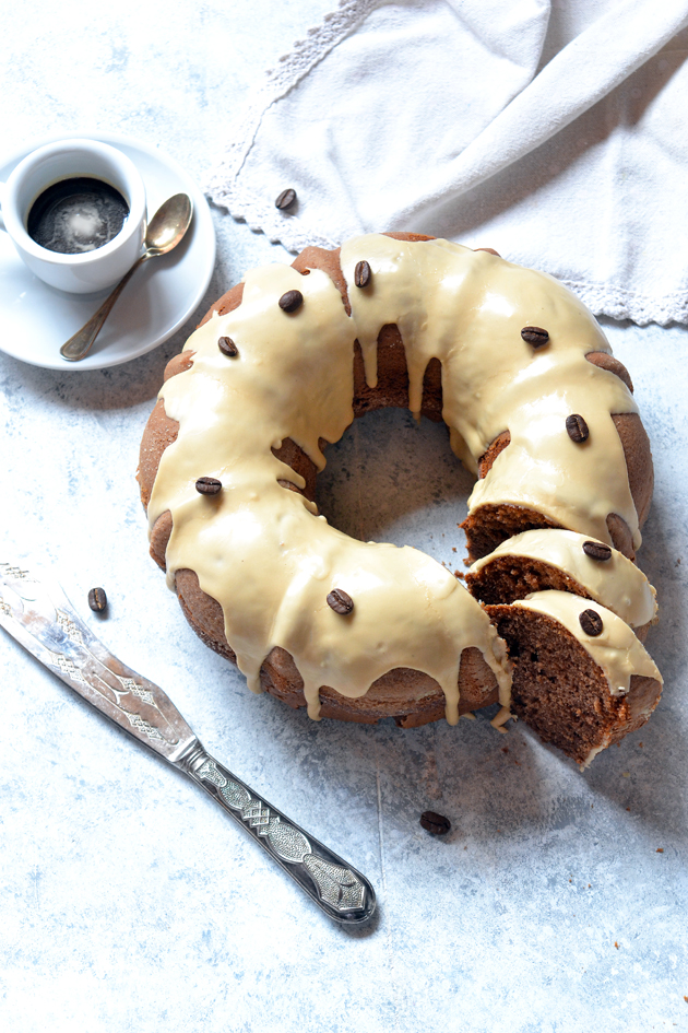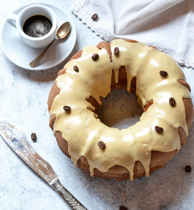 Soffice e intensamente profumata, il richiamo di questa ciambella al caffè, come quello del piffero magico è irresistibile. Perfetta per una colazione appagante ed energetica o per una dolce pausa pomeridiana. Ogni momento è buono per tagliarne una fetta. Potete gustarla senza glassa se volete contenere le calorie, anche se la glassa è quella chicca in più che la rende sensazionale. Se avete del caffè solubile vi consiglio di aggiungerne un cucchiaio nell’impasto mentre la montate, questo ne amplificherà l’aroma, io non ne avevo in casa quindi l’ho omesso, ma ho aggiunto un pochino di cacao che aiuta proprio ad intensificare l’aroma del caffè. Inoltre vi preciso che quando parlo di 100g di caffè, intendo che dovrete prepararlo con la moka e poi pesare il liquido ottenuto.