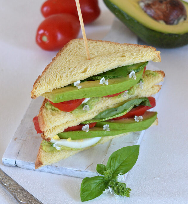 Tostate le fette di pane e poi tagliatele a metà formando 8 triangoli, a questo punto potrete comporre i sandwich, spalmate la fetta che costituirà la base del sandwich con la crema di avocado, aggiungete le fettine di uovo, poi quelle di pomodoro, poi le fettine di avocado e di zucchina, le foglie di basilico e infine chiudete con il triangolino di pane. Fate così per gli altri 3 sandwich e servite impilando i sandwich a due a due, infilzandoli per tenerli fermi con gli appositi bastoncini per spiedini