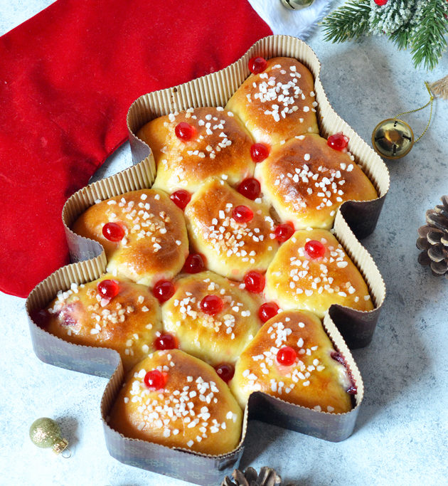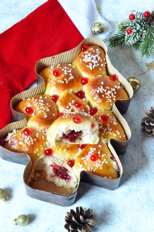 Non c’è colazione più dolce di quella di Natale, tra pacchetti scartati, lustrini e prelibatezze preparate con mani amorevoli. Di sicuro sulla vostra tavola imbandita a festa non potrà mancare questo lievitato, semplice da realizzare, come ogni mia ricetta, ma molto scenografico. Potrete cambiare la farcita secondo i vostri gusti, utilizzando sia la crema di nocciole che un’altra marmellata. Io ho scelto quella di lamponi per il suo colore rosso accesso, che si addice all’occasione.