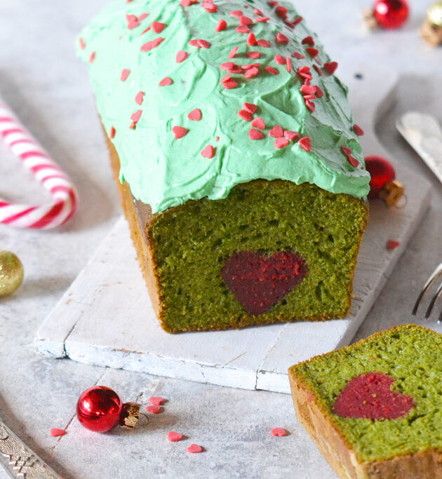 Il Grinch cake è un plum cake che ricorda nei colori e nella decorazione il famoso personaggio del film omonimo, i miei figli lo adorano e non c’è Natale che non lo riguardiamo. Il Grinch è verde ed odia il Natale e i Nonsochi, forse perché aveva le scarpe strette o più verosimilmente perché il cuore di tre taglie aveva più piccolo, ed ecco che l’impasto si colora di verde e al suo centro spunta un cuoricino rosso.