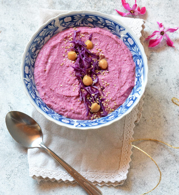 Con questa ricetta facciamo un salto in Medio Oriente, riscoprendo una delle sue ricette più antiche, leggermente rivisitata da me per conferirgli un colore speciale. L’hummus di ceci è una crema, perfetta per essere spalmata sui crostini, resa aromatica dall’aggiunta della salsa tahina, una salsa realizzata dal sesamo. Il limone invece conferisce una nota acidula, riequilibrando tutti i sapori. Prepararlo è davvero facile, potete utilizzare i ceci precotti e se riuscite a reperirla anche la salsa tahina confezionata, se non la trovate, nessun problema, vi lascio la ricetta per prepararla in pochi minuti.