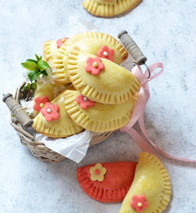 A questo punto stendete parte della frolla e con un coppapasta, ritagliate tanti cerchi di circa 12cm di diametro. Con un cucchiaino mettete al centro del cerchio parte dell’impasto, bagnate con l’albume il bordo del cerchio e richiudete. Con i rebbi di una forchetta sigillate i bordi.
