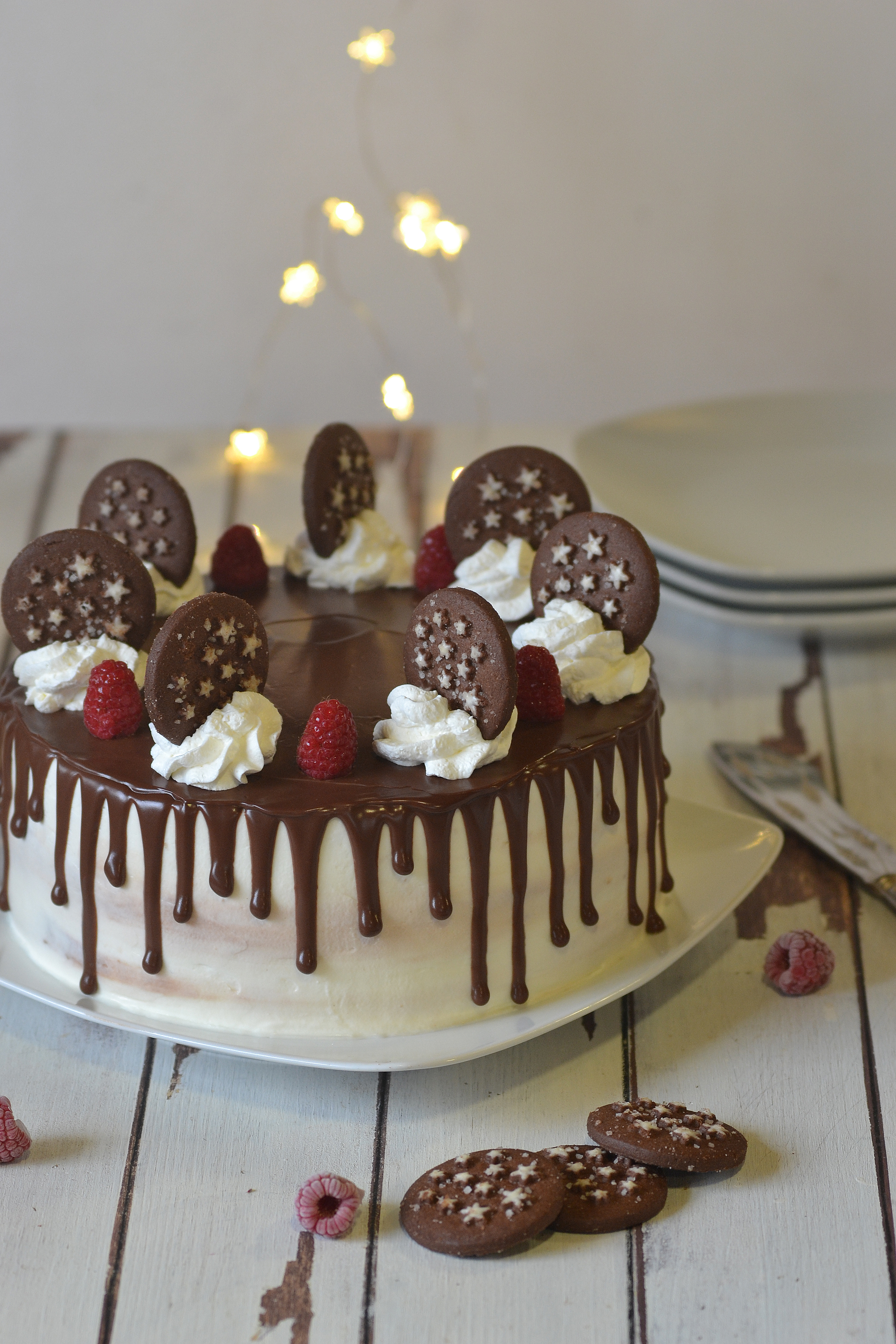 Mettete in frigo la torta e intanto preparate il drip, la colata di cioccolato, sciogliendo in un pentolino o al microonde il cioccolato con la panna. Riprendete la torta e con l’aiuto di un cucchiaino colate la ganache lungo il bordo, versate la restante parte sulla torta e con l’aiuto di una spatola spalmate su tutta la superficie. Con una sacca da pasticcere e della panna create dei ciuffi e su ognuno di questi ciuffi inserite un biscotto pan di stelle.